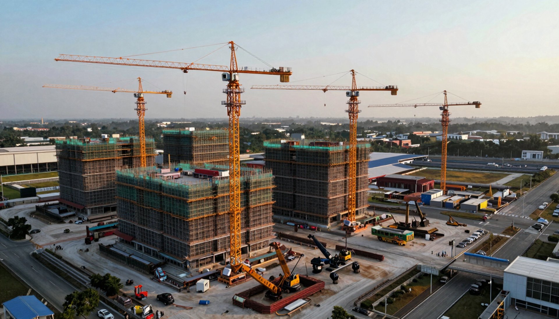 A professional Southeast Asian male surveyor in a high-visibility vest and white hard hat using a digital theodolite on a tripod at a large infrastructure construction site. Clear daylight, technical precision, modern construction equipment in the background.