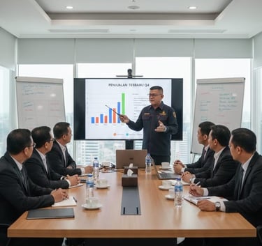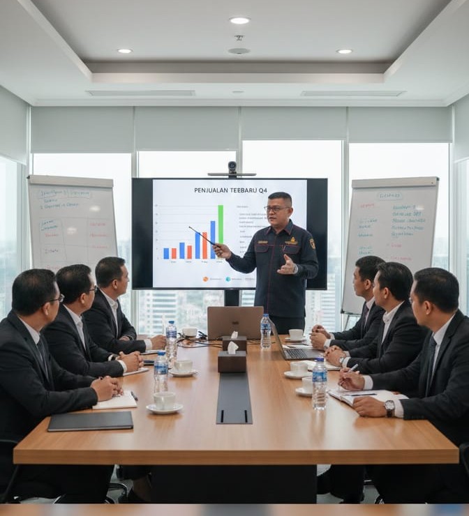 A focused meeting of construction professionals in a modern office in Indonesia, looking at a large wall-mounted screen displaying a 3D architectural model. Professional attire, collaborative atmosphere, navy blue lighting.